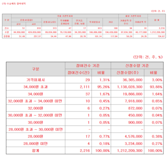 수요예측 결과는 매우 긍정적입니다. 총 2,216명의 참여자가 있었는데요. 총 청약 금액은 무려 1,212,209,300원이었습니다. 특히, 고가의 가격대에서 많은 참여가 있었고, 이는 더본코리아의 브랜드 가치가 높다는 것을 보여줍니다.