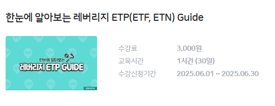 어떤 교육을 듣나요? 홈페이지에 접속하시면 '레버리지 ETP 교육'이라는 강좌가 보이실 거예요. 이걸 신청해서 들으시면 된답니다. ETP는 ETF와 ETN을 통틀어 부르는 말이니 걱정 마세요!
