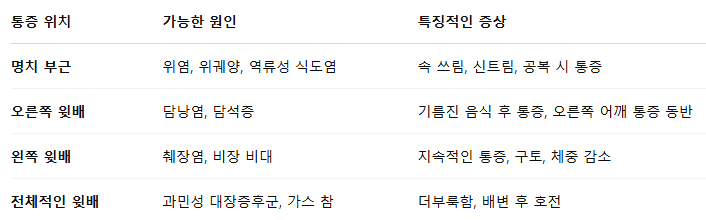 윗배 통증은 발생 위치와 양상에 따라 여러 가지 원인으로 나뉘는데요. 아래 표를 참고하면 원인을 쉽게 파악할 수 있어요.
