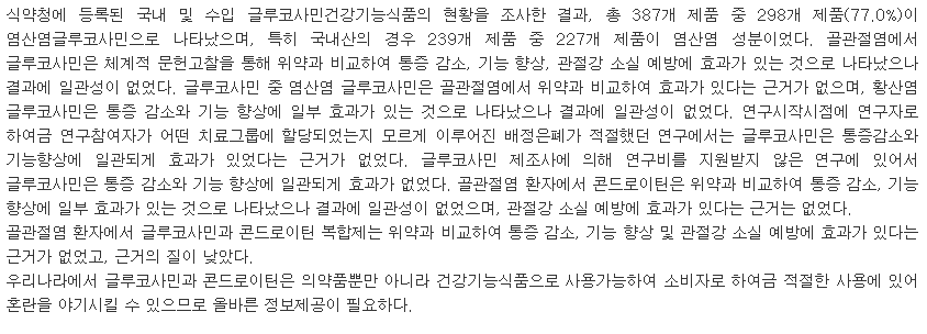 - 2020년 코크란 리뷰에서도 콘드로이친의 효과에 대해 유사한 결론을 내렸습니다. 이 리뷰는 기존의 여러 연구를 검토한 결과, 콘드로이친이 통증 완화에 있어 유의미한 효과를 보이지 않았으며, 부작용 발생률 또한 높지 않다고 언급했습니다.