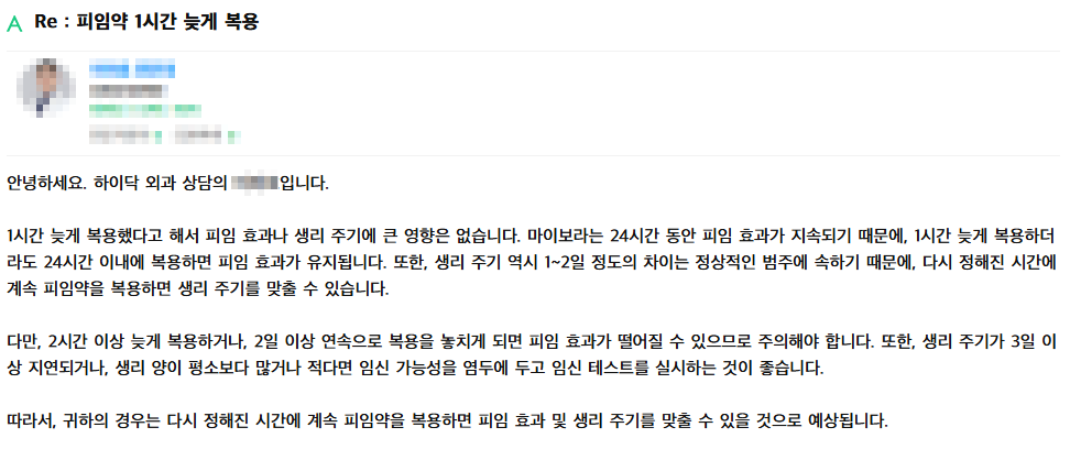 한 시간 정도 늦게 복용하는 것에 대해서는 피임이나 생리 주기에 영향이 크게 없다고 보시면 되는데요. 하지만 하루, 이틀 잊어버리고 복용 시간도 늦는다면 당연히 피임 효과가 떨어지기 때문에 추가 피임을 해주시는 게 좋아요.