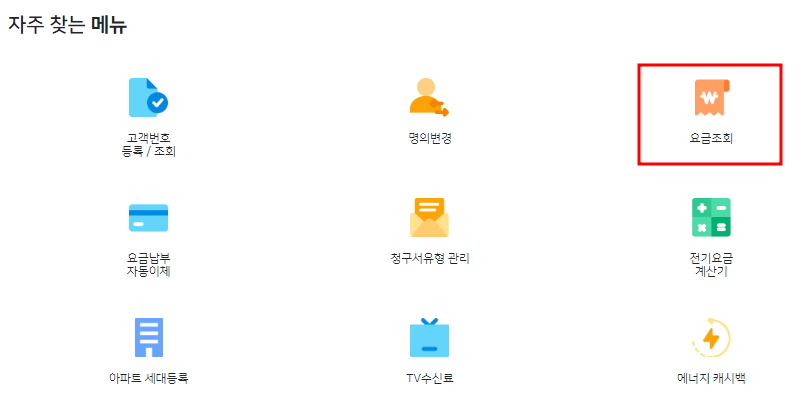 - 앱을 실행하고, "자주 찾는 메뉴"에서 "요금조회"를 선택해요.