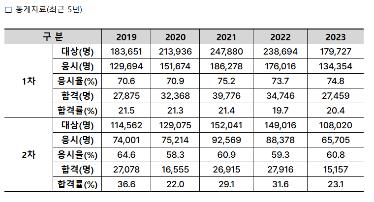 합격 기준은 매 과목 100점을 만점으로 매 과목 40점 이상, 전 과목 평균 60점 이상 득점해야 합격할 수 있어요. 최근 몇 년간의 합격률 통계를 보면, 응시자 수와 합격자 수가 어떻게 변화해왔는지 알 수 있어요.