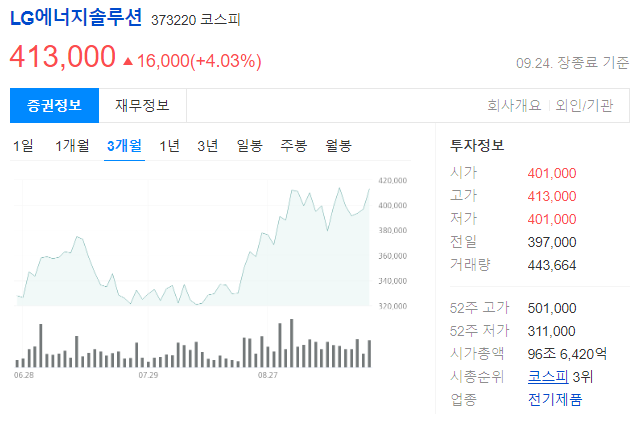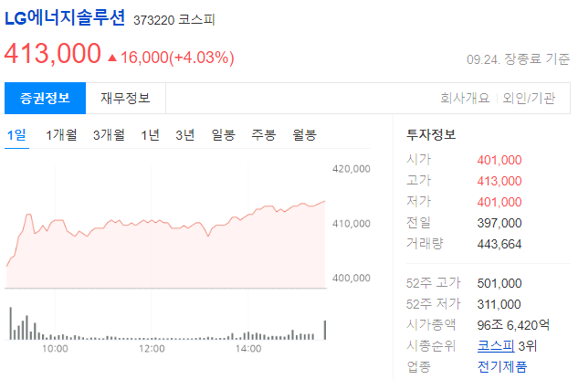 현재 LG에너지솔루션의 주가는 413,000원으로, 주가 변동성을 고려하면 단기 투자보다는 장기적인 관점에서 접근하는 게 좋아 보입니다. 특히 전기차 시장 성장과 함께 배터리 기술이 발전한다면 주가가 다시 오를 가능성이 높습니다.